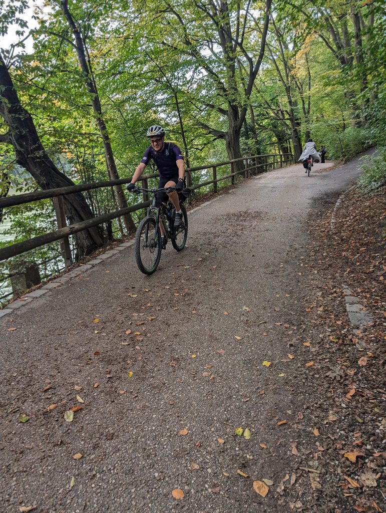 Alles rasen mit irrer Geschwindigkeit mir entgegen oder überholen – ohne Klingel – unerwartet von hinten. Das gilt vor allen Dingen für die Unterführungen der vielen Brücken, die einem auf den Weg begegnen. Verbotsschilder interessieren hier nicht, und ohne Rücksicht auf Verluste brettern alle hier herunter. Also vergewissere ich mich lieber drei Mal, ob ich irgendeine Linie überschritten habe. Ich weiß jetzt nicht, warum es alle so eilig haben und unter Zeitdruck stehen. Aber vielleicht haben die bayerischen Fahrradfahrenden von Natur aus strammere Wadln und können deshalb stärker in die Pedale treten oder sind besonders ehrgeizig. Man weiß es nicht. Ich weiß nur, dass man das Ganze in Düsseldorf wesentlich gemütlicher angeht und so sollte es auch sein.