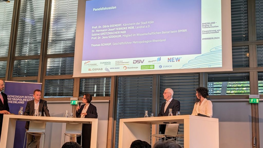 Spannende Veranstaltung der Metropolregion Rheinland zum Thema „Finanzierung von Strukturwandel und Transformation“. Was auf den ersten Blick etwas langweilig klingt, birgt erhebliches Konfliktpotenzial. Auf dem Podium des Parlamentarischen Abends in Berlin diskutierten Prof. Dr. Dörte Diemert, Beigeordnete für Finanzen und Recht der Stadt Köln, die rheinischen Bundestagsabgeordneten Sabine Grützmacher (BÜNDNIS 90/DIE GRÜNEN) und Dr. Hermann-Josef Tebroke (CDU/CSU-Bundestagsfraktion) sowie Prof. Dr. Jens Suedekum, Professor für Internationale Wirtschaft an der Heinrich-Heine-Universität Düsseldorf.